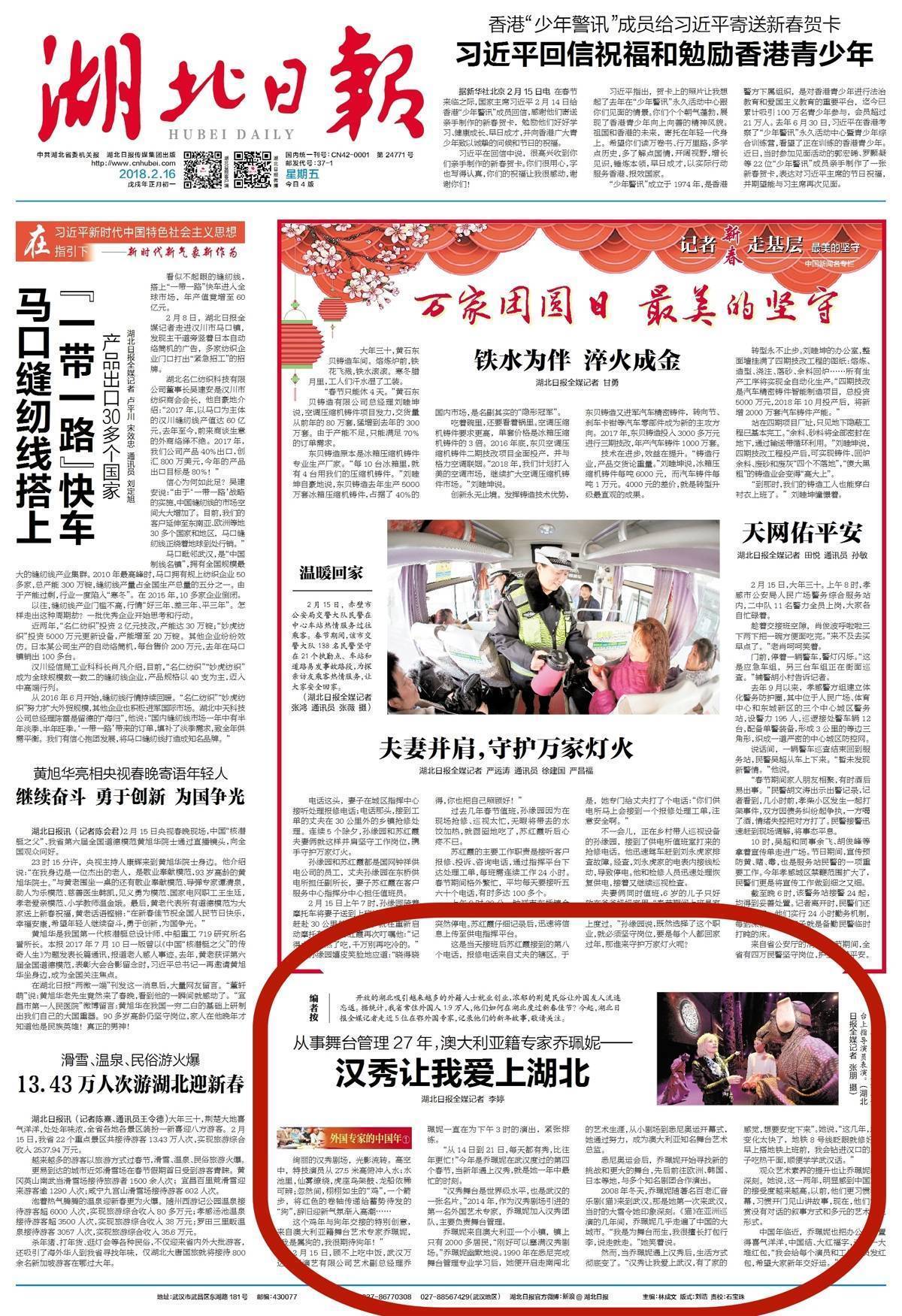2018年2月18日被乔珮妮珍藏的《湖北日报》头版,有她的一篇专访。
